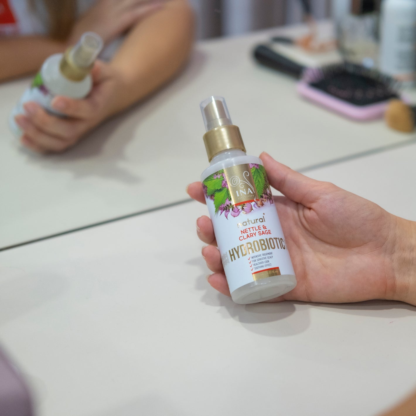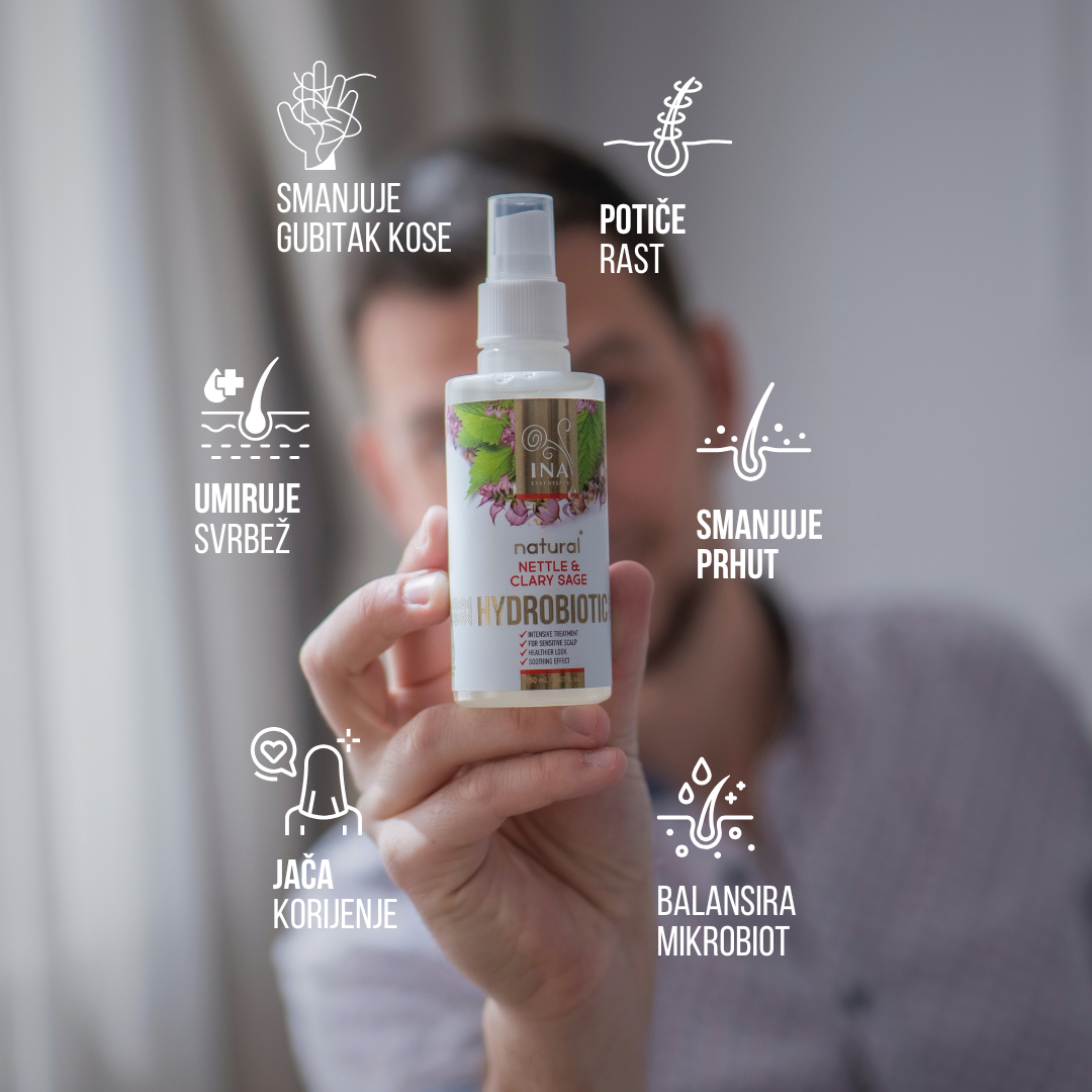 Za optimalne rezultate raspršite Hydrobiotic - koprivu i muškatnu kadulju u korijen i duljinu kose prije spavanja. Pogodno za korištenje svaku večer.