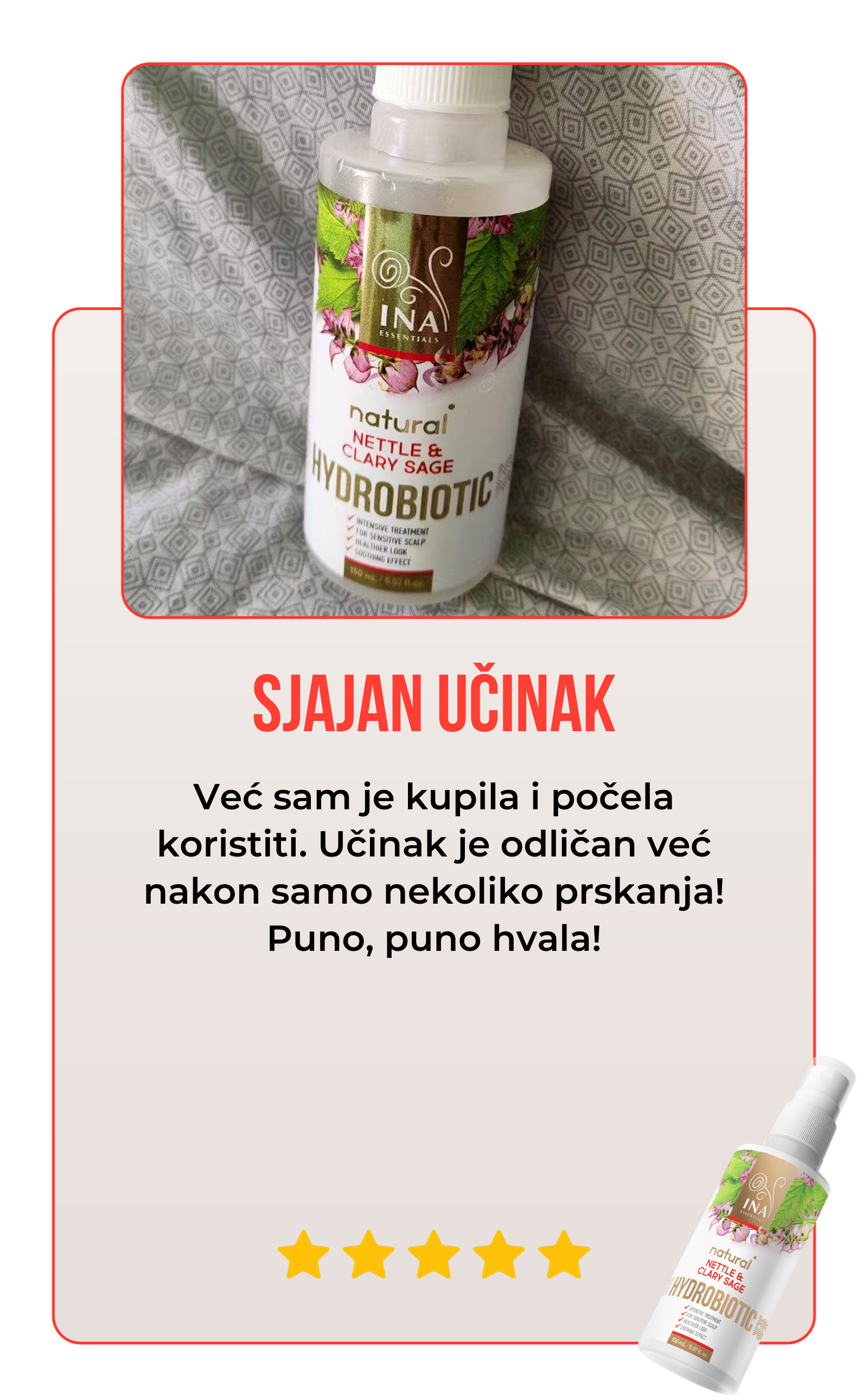 Hydrobiotic - kopriva i muškatna kadulja više je od same prekrasne bočice. Potvrđen je svjedočanstvima stvarnih kupaca. S impresivnim rezultatom zadovoljstva kupaca od preko 90%, naš proizvod pokazuje svoju učinkovitost. Nemojte nam samo vjerovati na riječ. Pročitajte priče naših kupaca OVDJE.