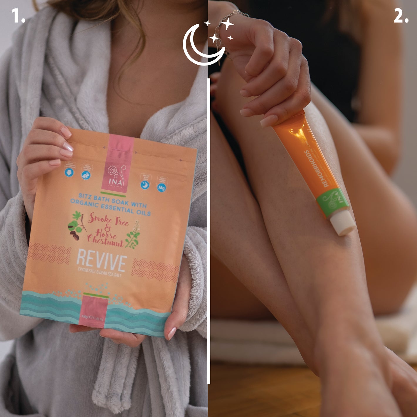 - Korak 1: 1-3 puta tjedno počastite se opuštajućom kupkom koristeći naše Revive Sitz soli za kupanje s dimljenim stablom i divljim kestenom. Ove soli, obogaćene ekstraktom divljeg kestena i uljem dima, ublažavaju osjećaj težine i umora u nogama, smanjuju stres i potiču regeneraciju kože. Magnezij u soli pomaže u poticanju regeneracije kože, potičući brže olakšanje zahvaćenih područja.